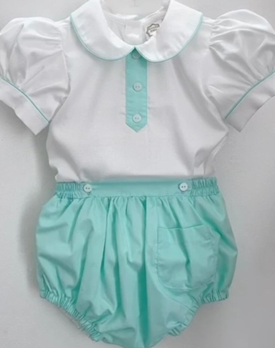 Boys Mint & White front pockket romper .